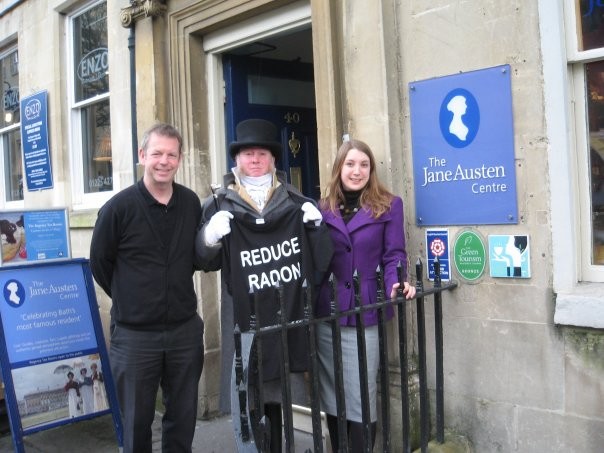 Pro Ten Services, official UK Radon TEE coordinators have launched the United Kingdom leg of the trek with visits to the Health Protection Agency and the British Research Establishment. On its first outing, the UK TEE accompanied ProTen Managing Director, Martin Freeman, to a consultation meeting at the Health Protection Agency, where potential changes to radon policies were discussed. The following day, the TEE attended a symposium at BRE Headquarters on estates management for school bursars, where ProTen Services presented a seminar on radon risks, regulations and remediation techniques. The city of Bath has become the latest stop on the Radon TEE World Trek UK tour. Famed for its Georgian architecture, Roman thermal spa and being the one-time home to Jane Austen, Bath is the only city in Britain to be designated as a World Heritage Site. The Jane Austen Centre in Bath has tested for radon and is pleased to support the Radon TEE campaign. ProTen Services’ Rebecca Kench accompanied TEE to meet Centre Director, David Baldock, and Martin Salter, who dresses in Regency costume and greets visitors to the Centre. It is reputed that Mr. Salter is the most photographed man in England, posing for an estimated 13,000 pictures each year. Perhaps TEE will become such a STAR!