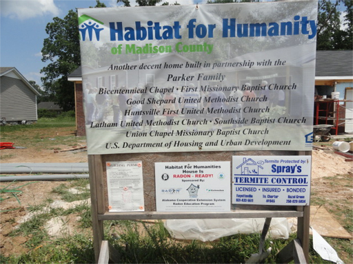 The partnership was originally developed with the Huntsville Habitat for Humanity for Madison County by Mr. Walter Rodgers, Madison County Urban Regional Extension Agent in the Madison County Extension System Office. Over the past 2 years Mr. Rodgers and I had talked about making contact with the Habitat for Humanity Organization for Madison County. In July 2010, Mr. Rodgers heard that there were going to be some habitat homes built in Northwest Huntsville, so he contacted Mr. Don Adams, Construction Project Manager for Habitat Humanity for Madison County to talk to him about putting the radon system in the habitat homes.