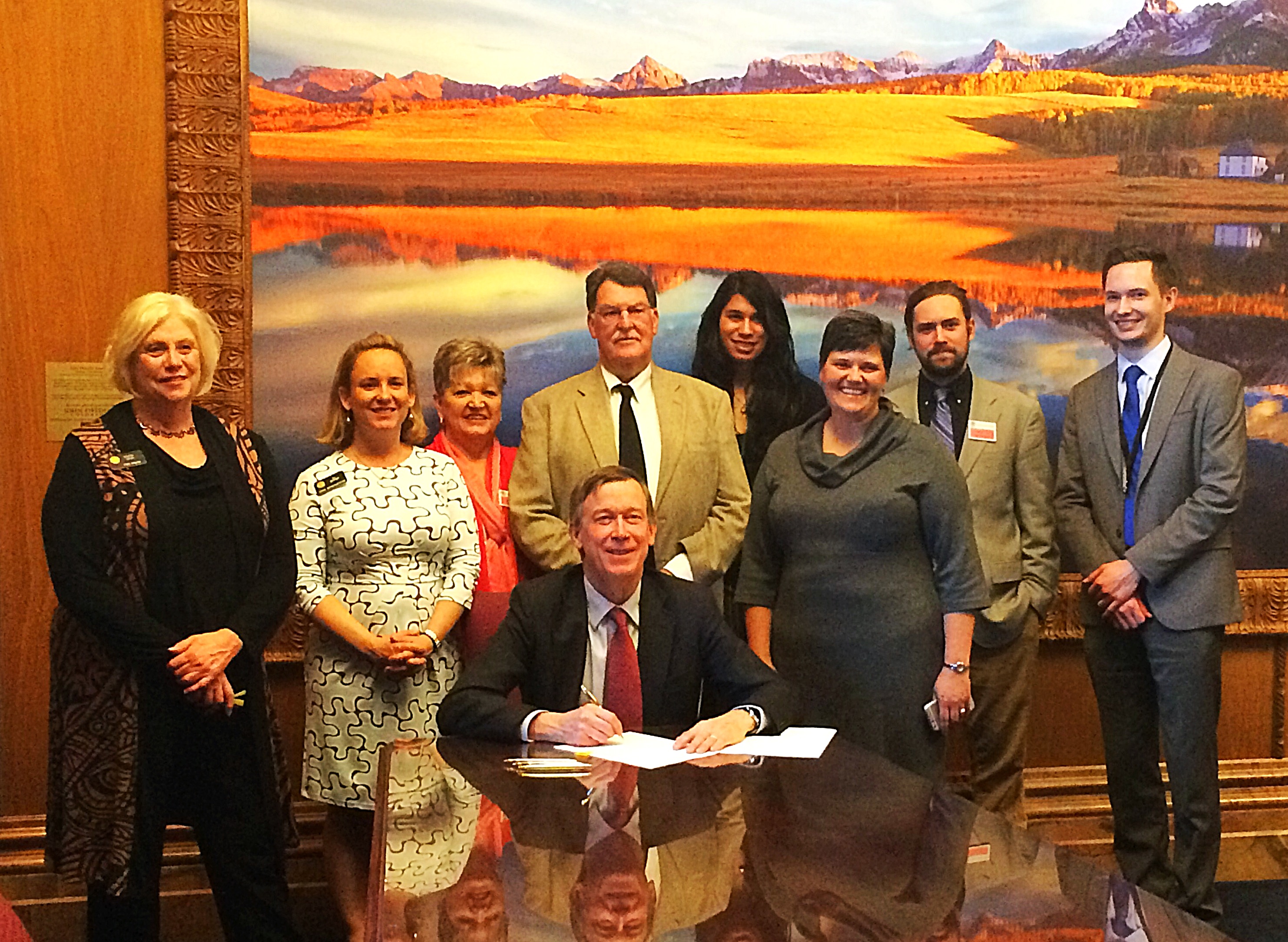 Colorado HB 16-1141 was signed by Governor Hickenlooper on April 21, 2016. The bill, initated by the Radiation Program at the Colorado Department of Public Health and Environment (CDPHE), provides for state funding of a radon education and awarness program at CDPHE and provides $100,000 for the Department to assist low income individuals with the installation of radon mitigation systems in their homes. Jennifer Opila, Colorado Radiation Program Manager, attended the bill signing and is pictured in the attached photo with the Governor, three of the bill sponsors; Senator Jahn and Representatives Becker and Coram and their staff.